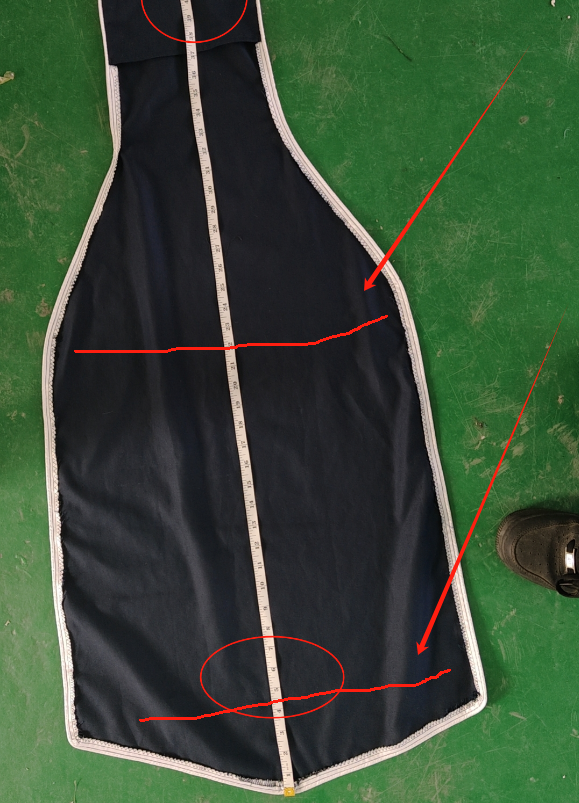 Here is an early stage technical photo that includes a prototype of the Penguin, as well as digital markings from both the seamstress, and designer, working on sizing clarifications.